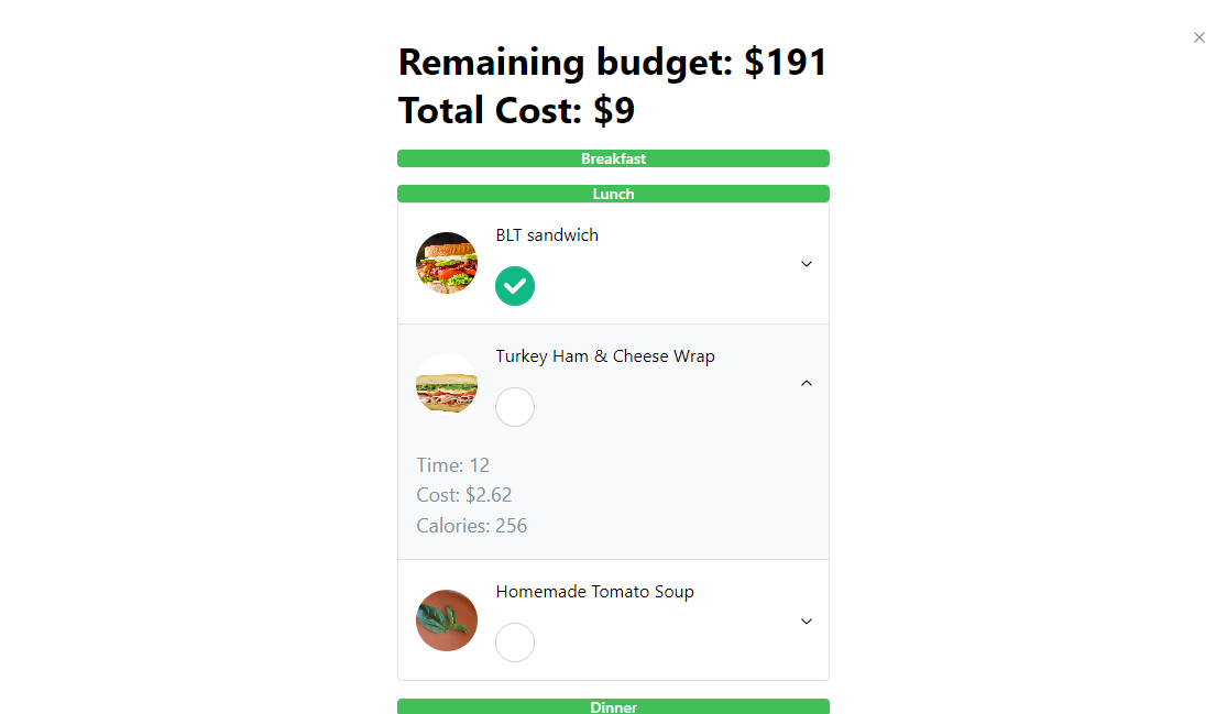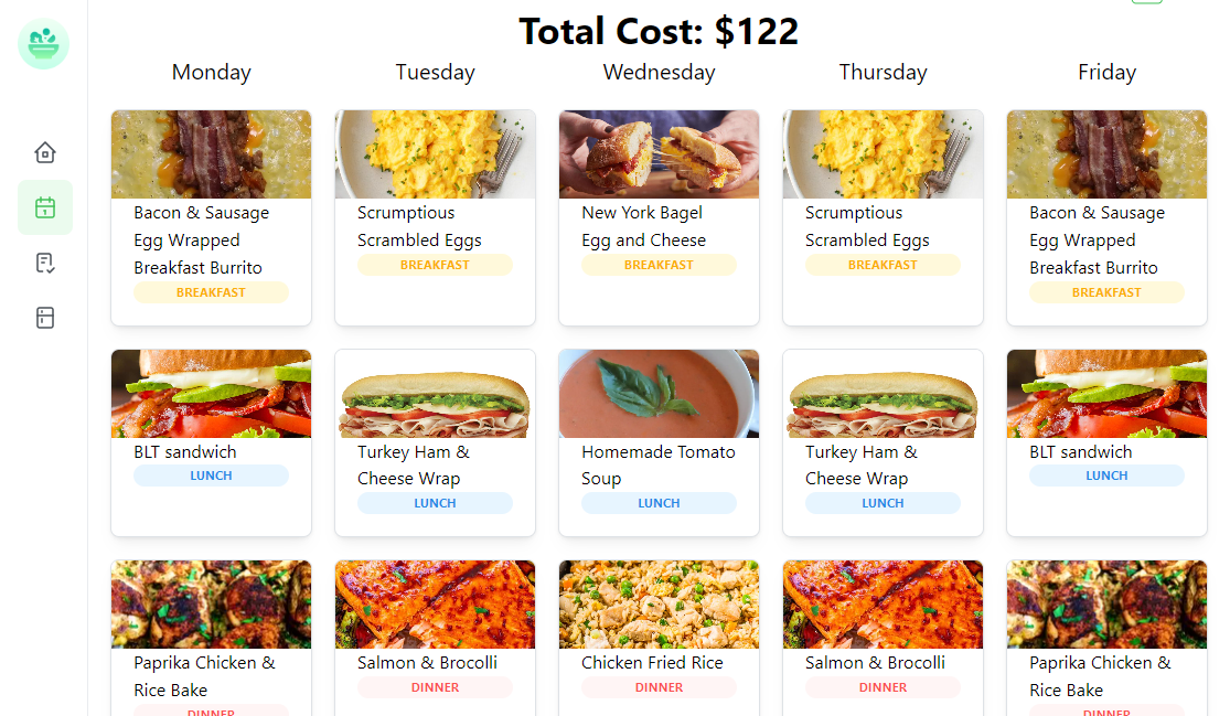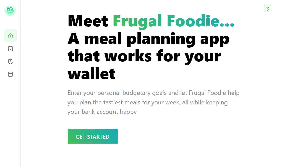 Frugal foodie is a hackathon project that won "Most Socially Beneficial" at HackUMBC 2022. I built this platform with 3 other students in the span of 24 hours. It is a web application that suggests a full week's meal plan for college students based on their budget. The app automatically generates a grocery list for the week, and also has an AI-assisted recipe generator that intelligently uses the ingredients that someone has on hand.